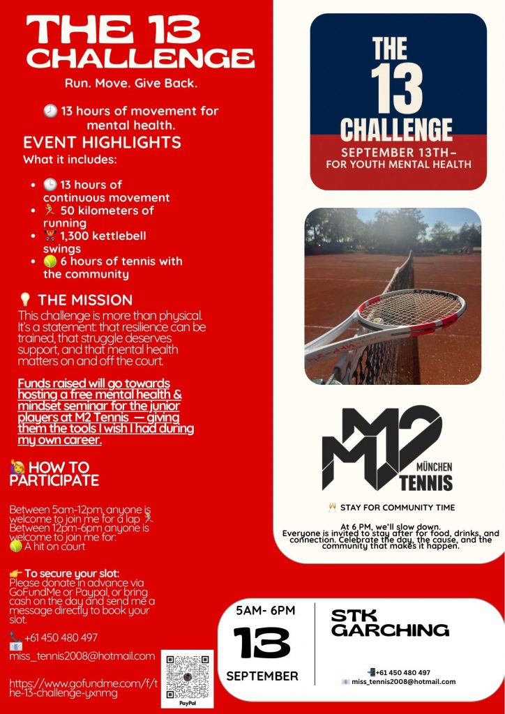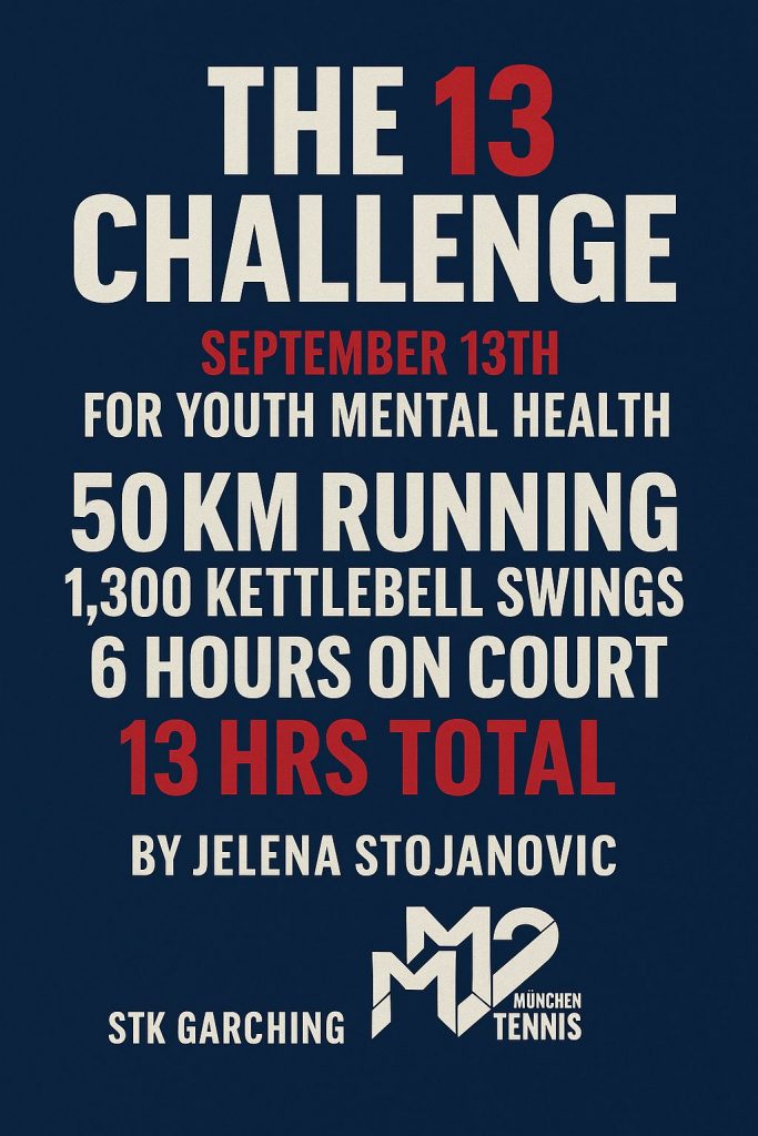 Am 13. September findet ein ganz besonderes Event auf unserer Anlage statt. Jelena Stojanovic, ehemalige Profispielerin und Trainerin bei M2Tennis, organisiert „The 13 Challenge“. Sie hat vor, in 13 Stunden folgende Aktivitäten durchzuführen: